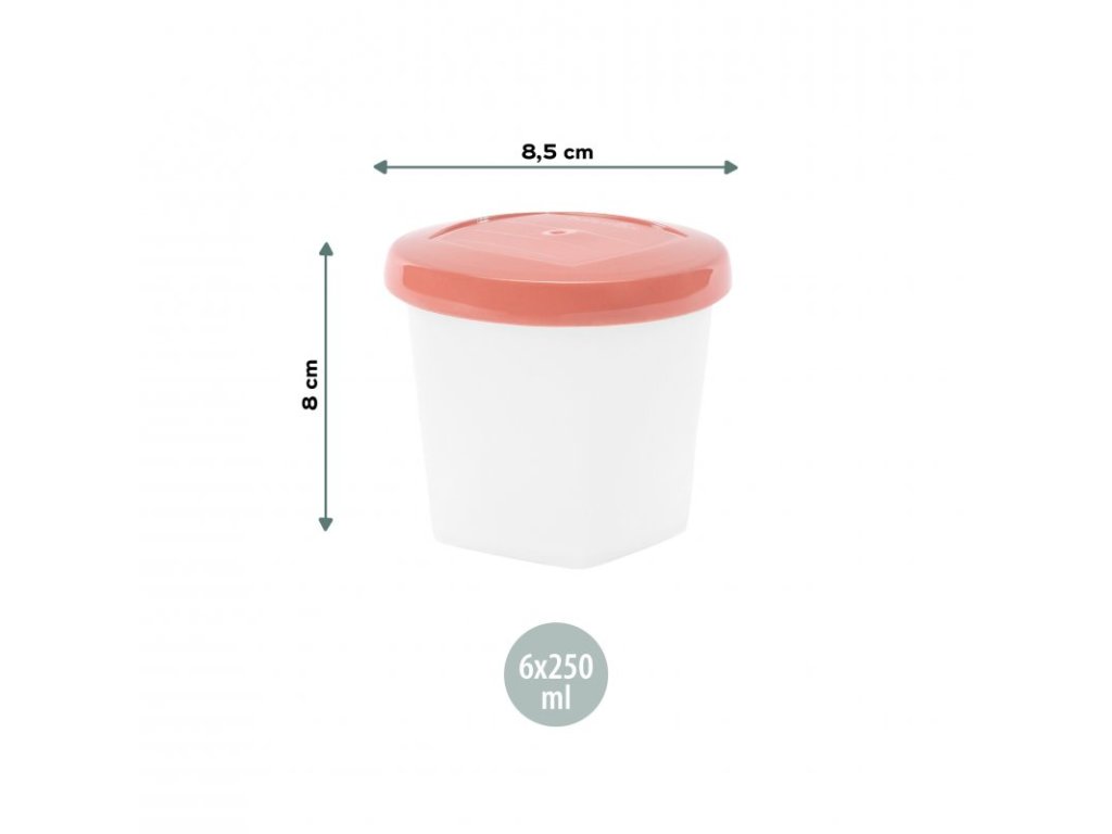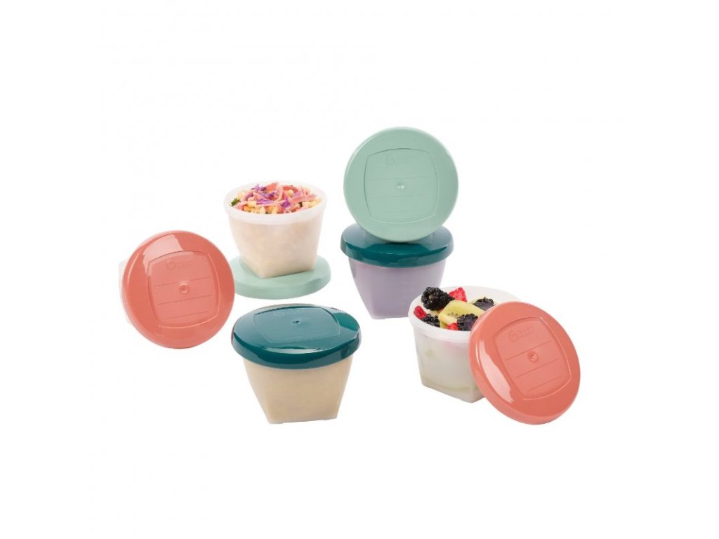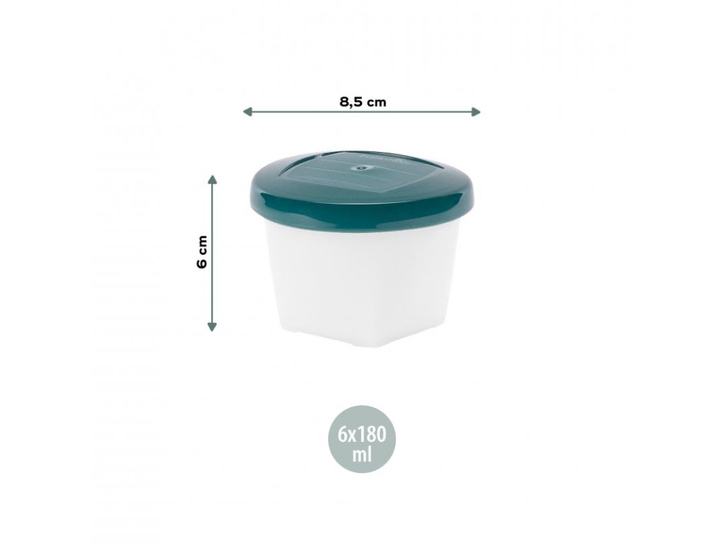Sada obsahuje 6 misiek s objemom 250 ml a 180 ml, pričom každá z nich je vybavená farebným skrutkovacím viečkom. Misky sú stohovateľné a skladné – prázdne sa dajú pohodlne vložiť do seba. Vďaka odolnému materiálu ich možno použiť v mikrovlnnej rúre, mrazničke, ohrievačke fliaš aj pri sterilizácii (max. 80 °C). Súčasťou je aj praktická stupnica a miesto na poznámky, ideálne na označenie dátumu či druhu jedla.