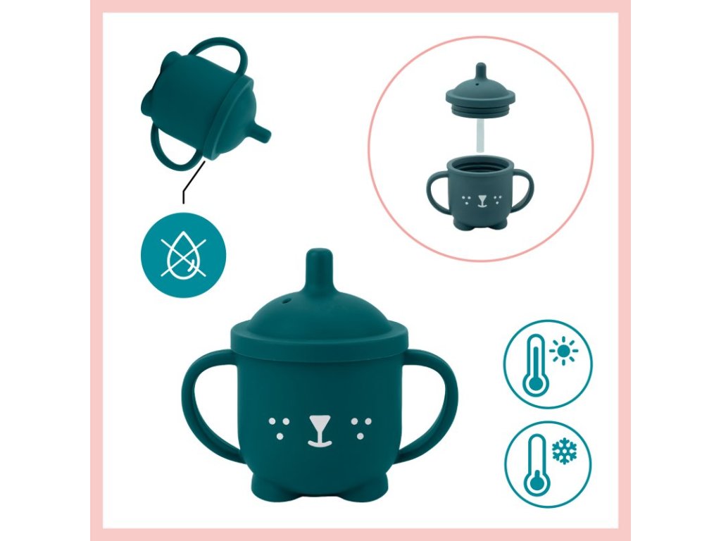 Hrnček s viečkom a náustkom, dvoma rúčkami pre lepší úchop a stabilizačnými nôžkami.