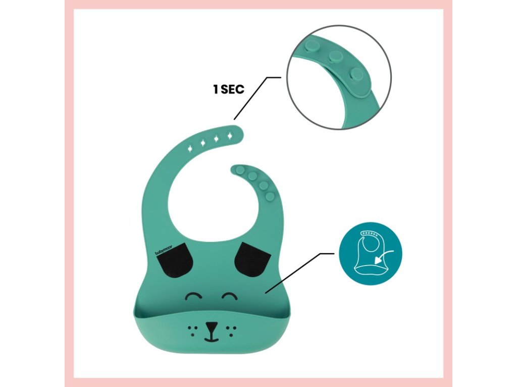 Podbradník s nastaviteľným zapínaním a veľkým vreckom na zachytenie popadaného jedla.