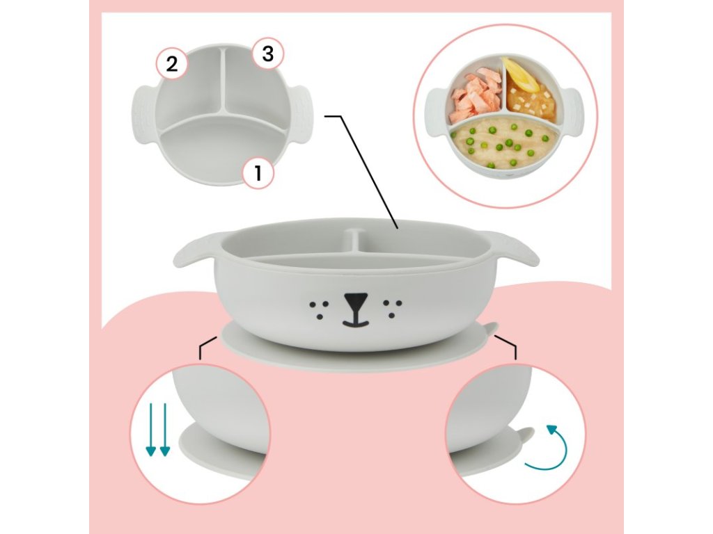 Veľkú misku s protišmykovou prísavkou a 3 oddelenými priehradkami – ideálna na podávanie viacerých jedál naraz.