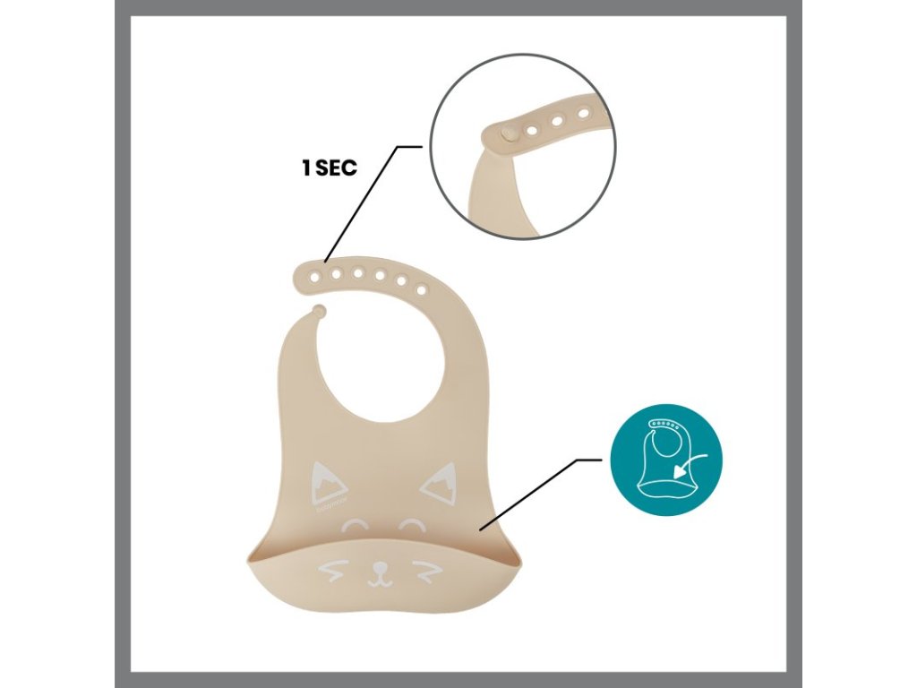 Podbradník so zachytávacím vreckom minimalizuje neporiadok pri jedle a má nastaviteľné zapínanie, ktoré rastie spolu s dieťaťom.