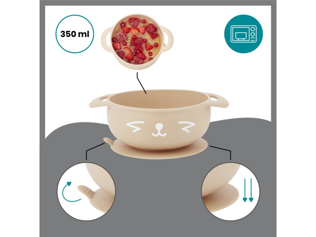 Miska s objemom 350 ml má širokú prísavku, ktorá pevne priľne k stolu či pultíku jedálenskej stoličky a znižuje riziko rozliatia. Lyžička je vyrobená z mäkkého, poddajného silikónu – ideálneho pre citlivé ďasná – a vďaka ergonomickej rukoväti ju dieťa ľahko uchopí v každom smere. Po stranách má integrované hryzátka, ktoré uľavia od svrbenia pri prerezávaní prvých zúbkov.