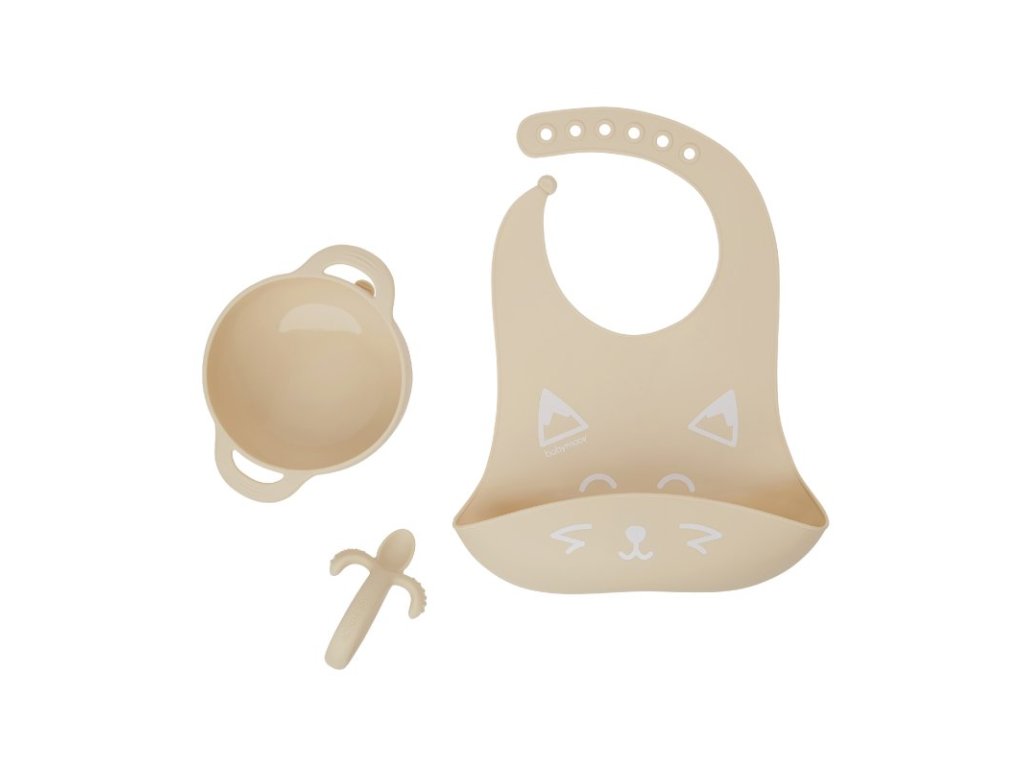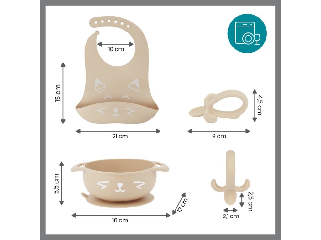Celá sada je vyrobená zo 100 % potravinárskeho silikónu, ktorý neobsahuje BPA ani ftaláty. Je vhodná na umývanie v umývačke riadu a miska sa dá použiť aj v mikrovlnnej rúre.
