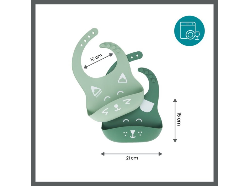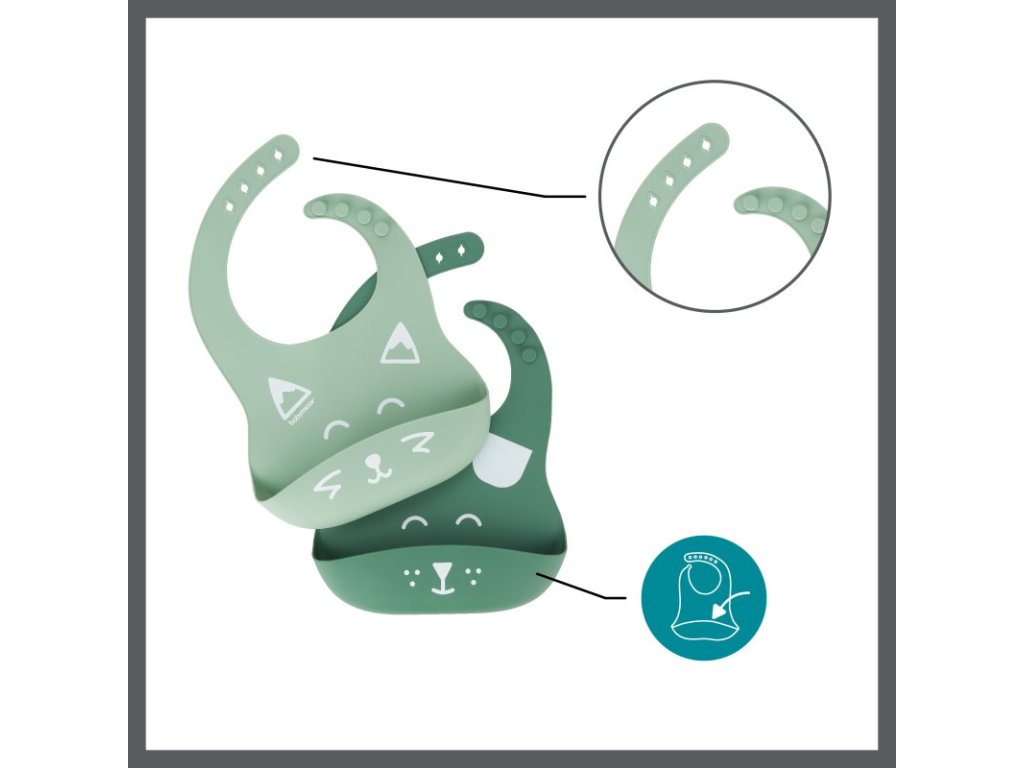 Podbradníky možno jednoducho opláchnuť alebo umývať v umývačke riadu. Vďaka svojmu trendovému dizajnu sú vhodné pre chlapčekov aj dievčatká a stanú sa nenahraditeľným pomocníkom pri každom jedle.