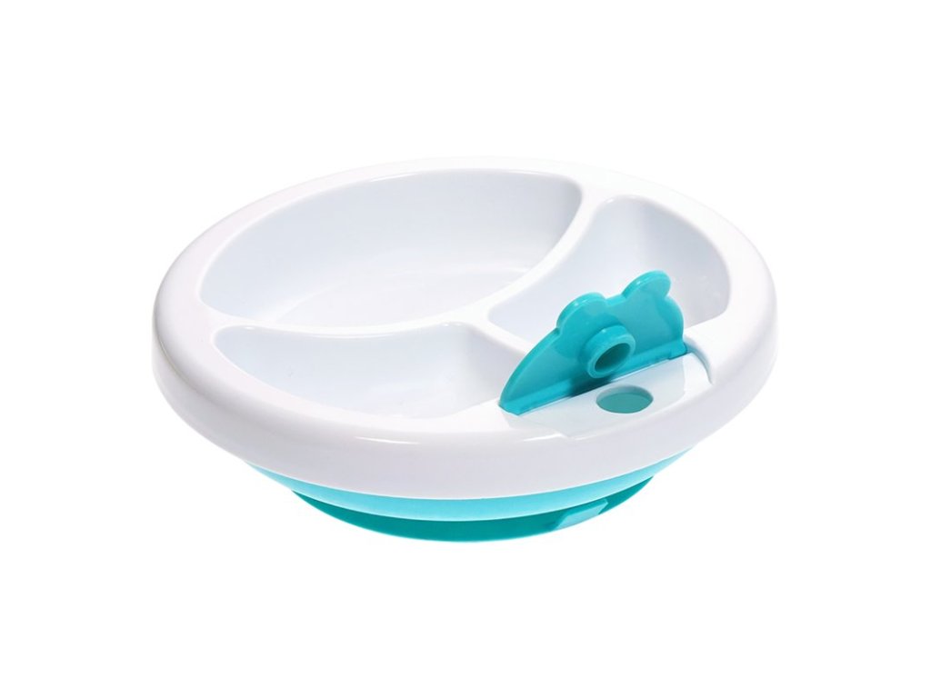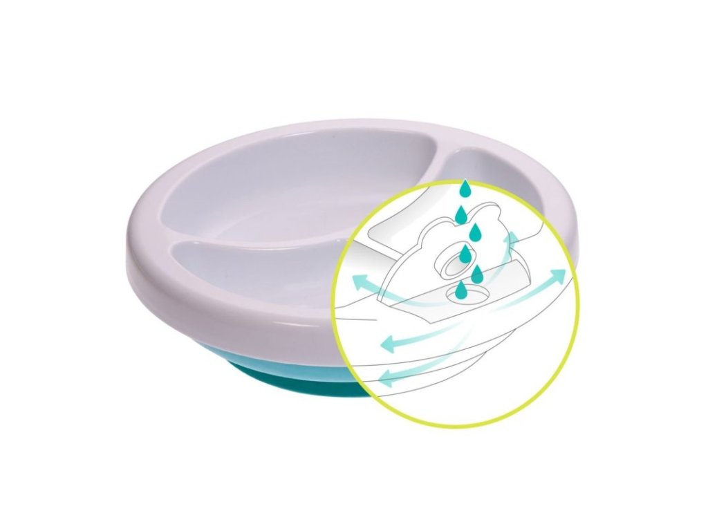 Detský tanier s možnosťou ohrevu – vďaka zásobníku na horúcu vodu udrží pokrm dlhšie teplý. Má 3 oddelené priehradky a silnú prísavku. Priemer 18 cm, od 4 mesiacov.