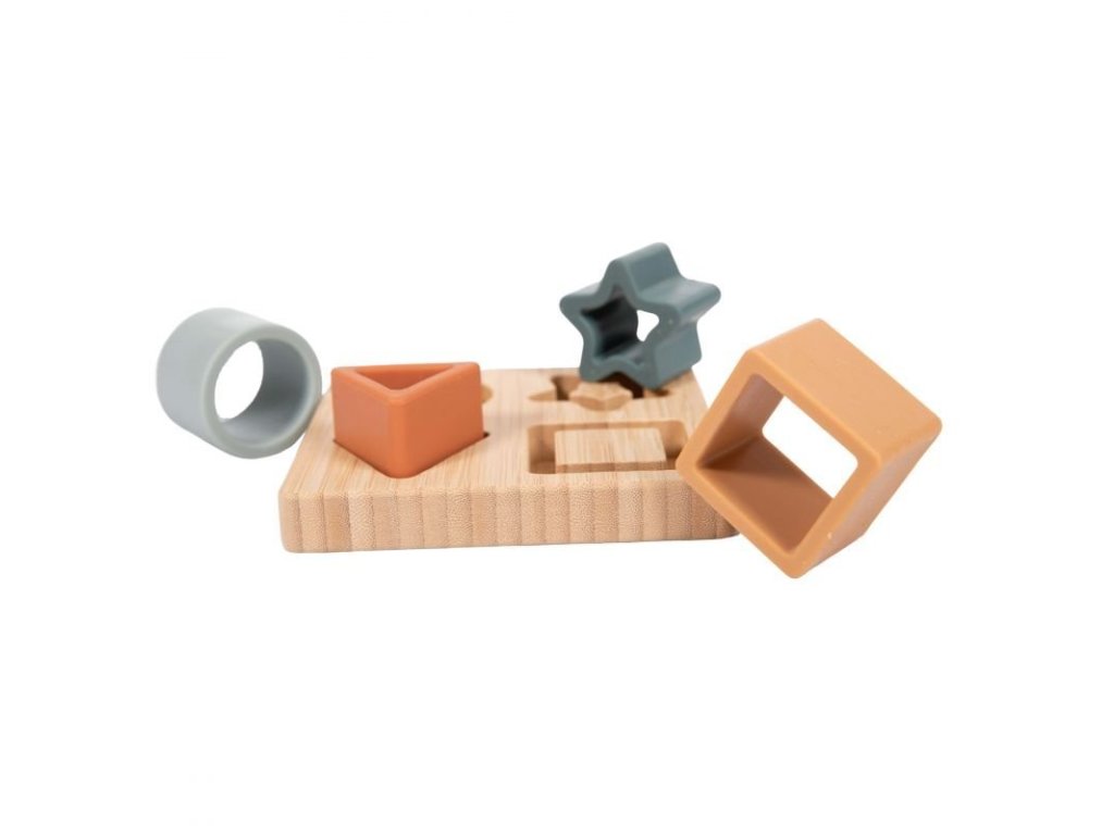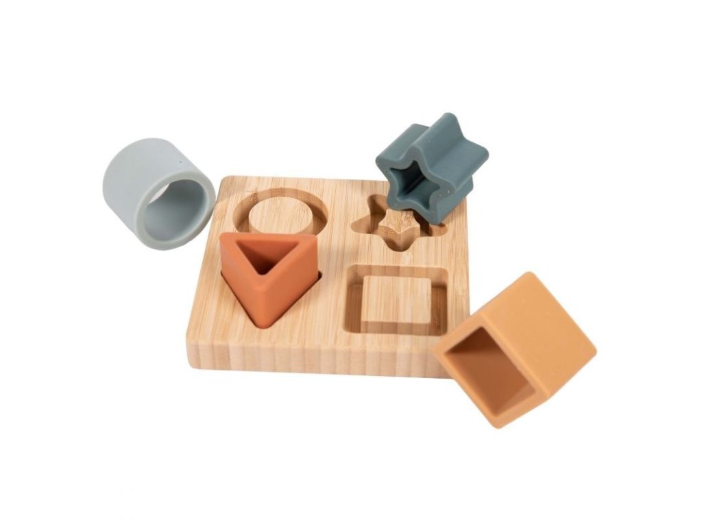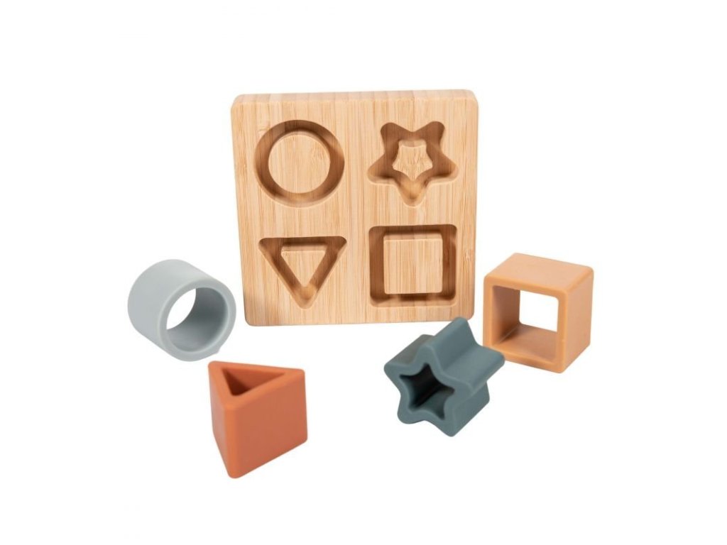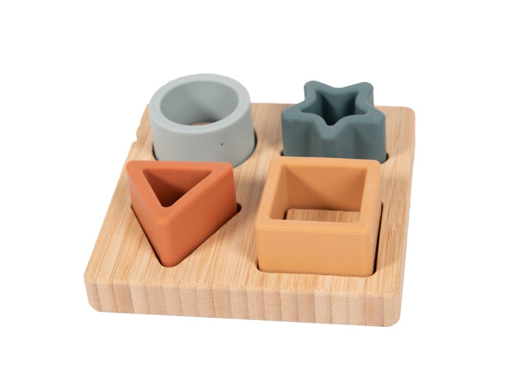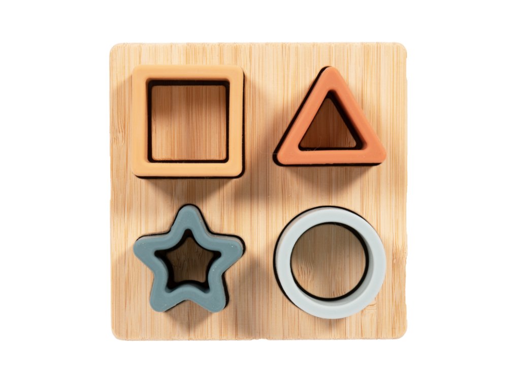 Základňa je vyrobená z kvalitného bambusu, ktorý je ekologický a pevný. 4 rôzne pastelové tvary – hviezda, kruh, trojuholník a štvorec – sú vyrobené z jemného potravinárskeho silikónu, ktorý je príjemný na dotyk a bezpečný na hryzenie.