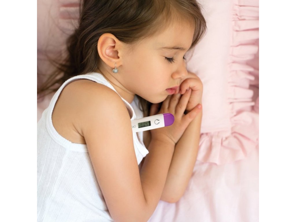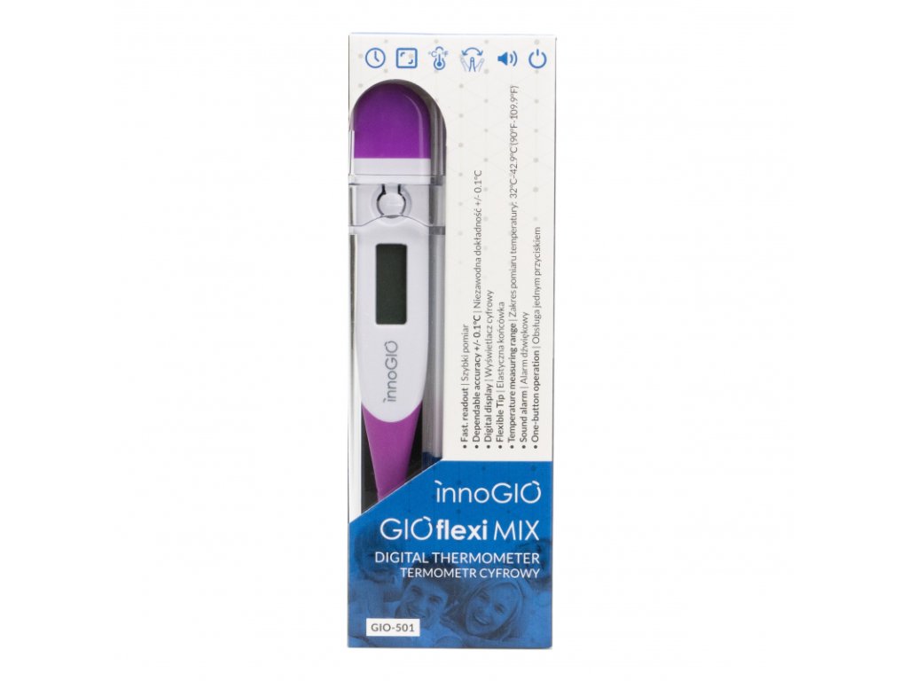 Digitálny teplomer GIOflexi Purple je praktický pomocník na spoľahlivé a pohodlné meranie telesnej teploty doma aj na cestách. Vďaka flexibilnej špičke je vhodný na použitie v ústach, podpazuší či rektálne, pričom zaisťuje väčší komfort najmä pri meraní u detí.