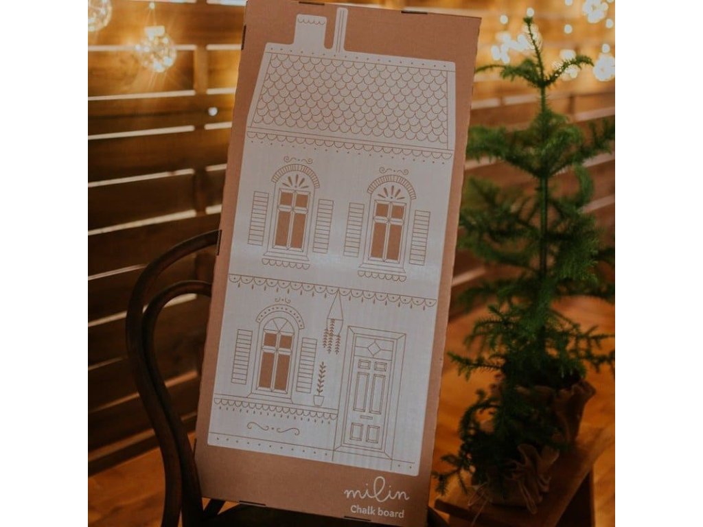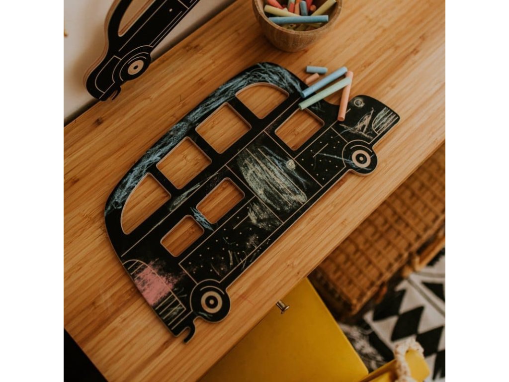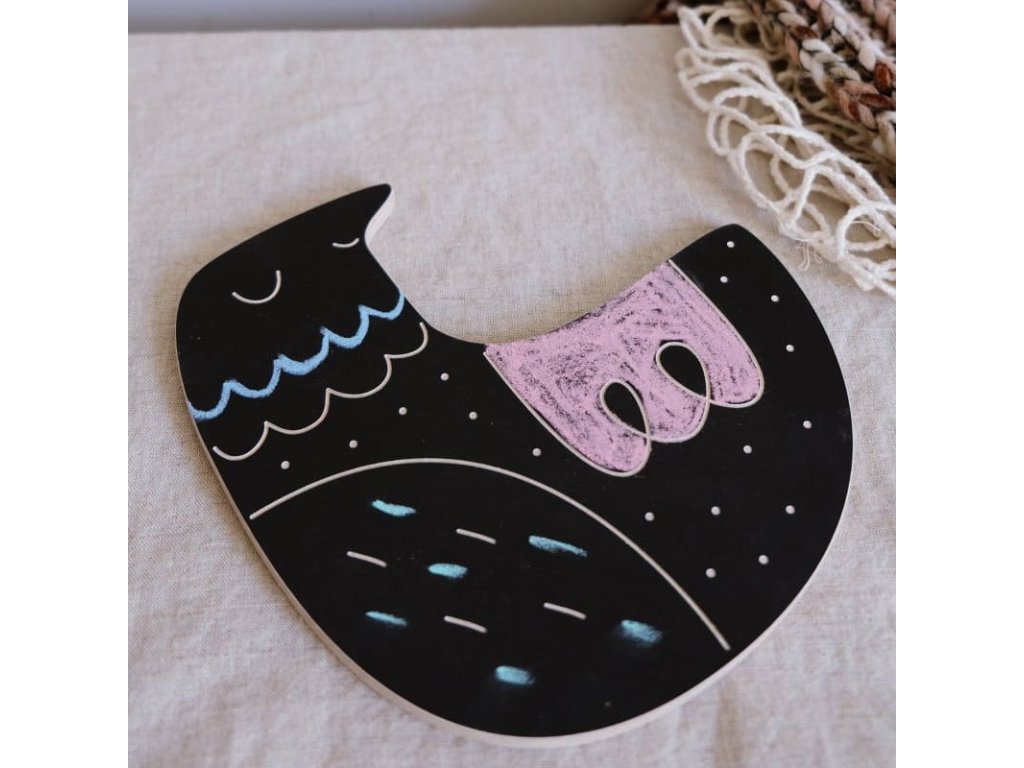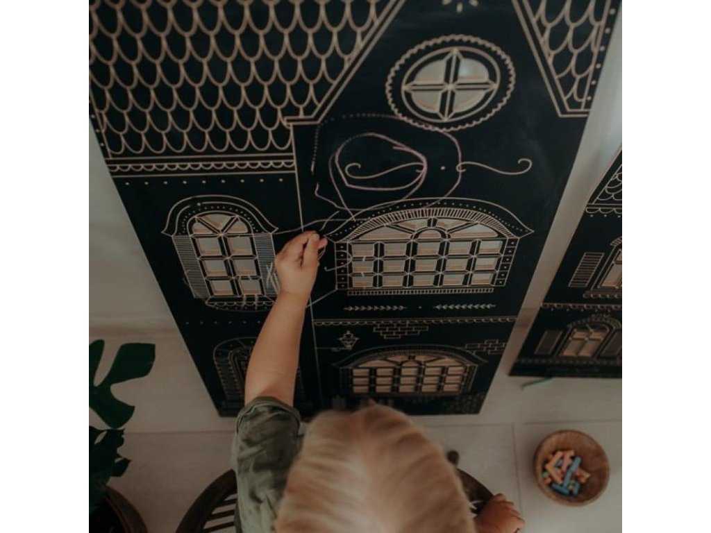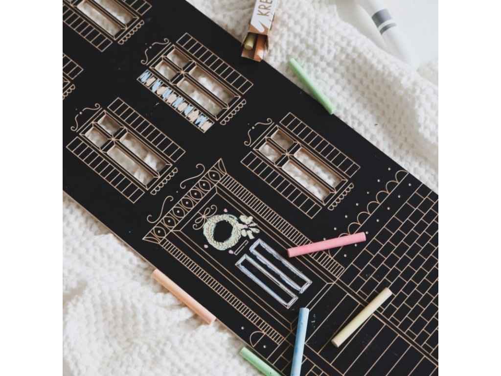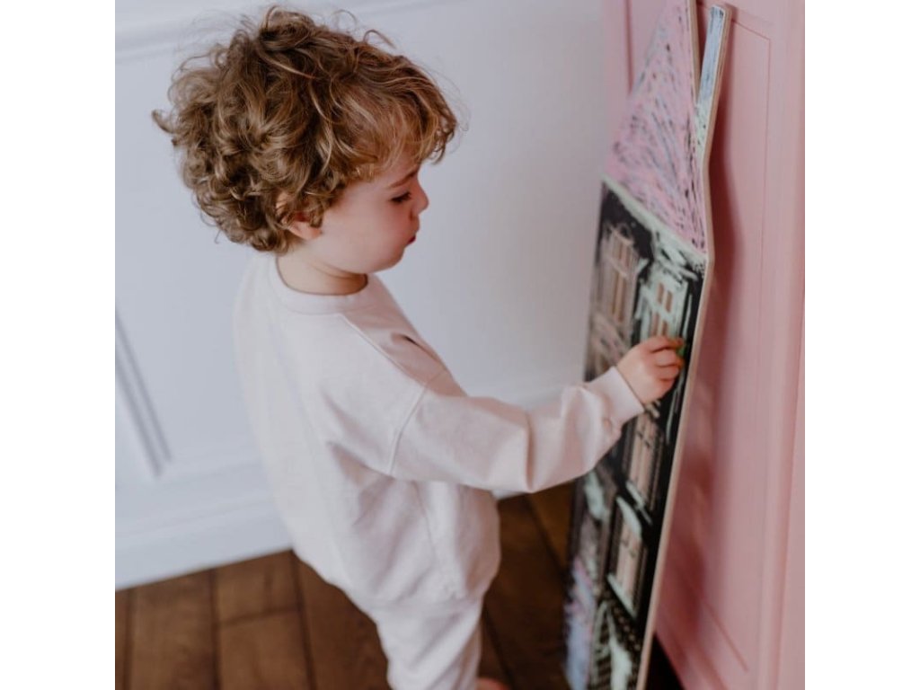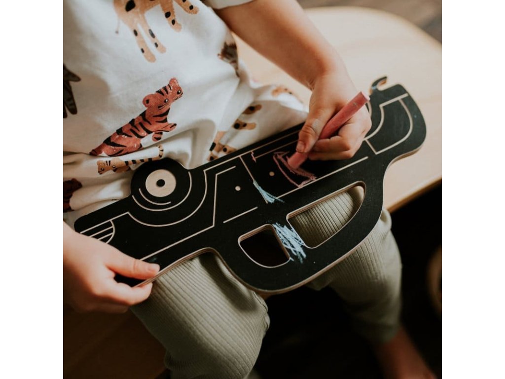 Tabuľka má drevenú konštrukciu z brezovej preglejky, pričom jedna strana je upravená pre kreslenie kriedou, doplnená o gravírované detaily, ktoré zvyšujú zábavu aj hmatové vnímanie. Druhá strana je hladká, biela – ideálna na ďalšie kreatívne aktivity.