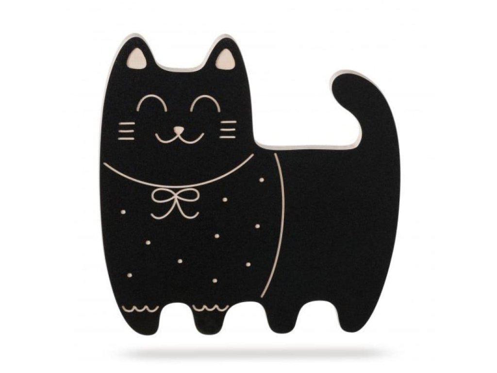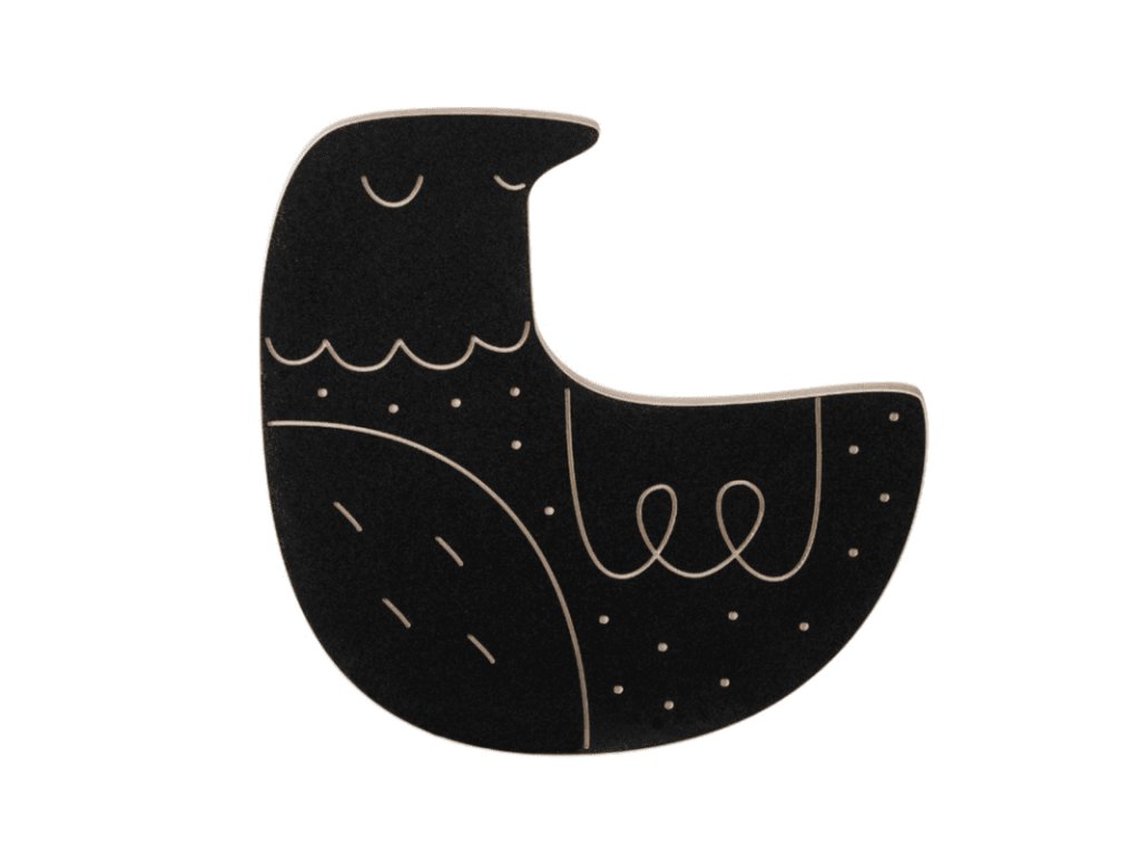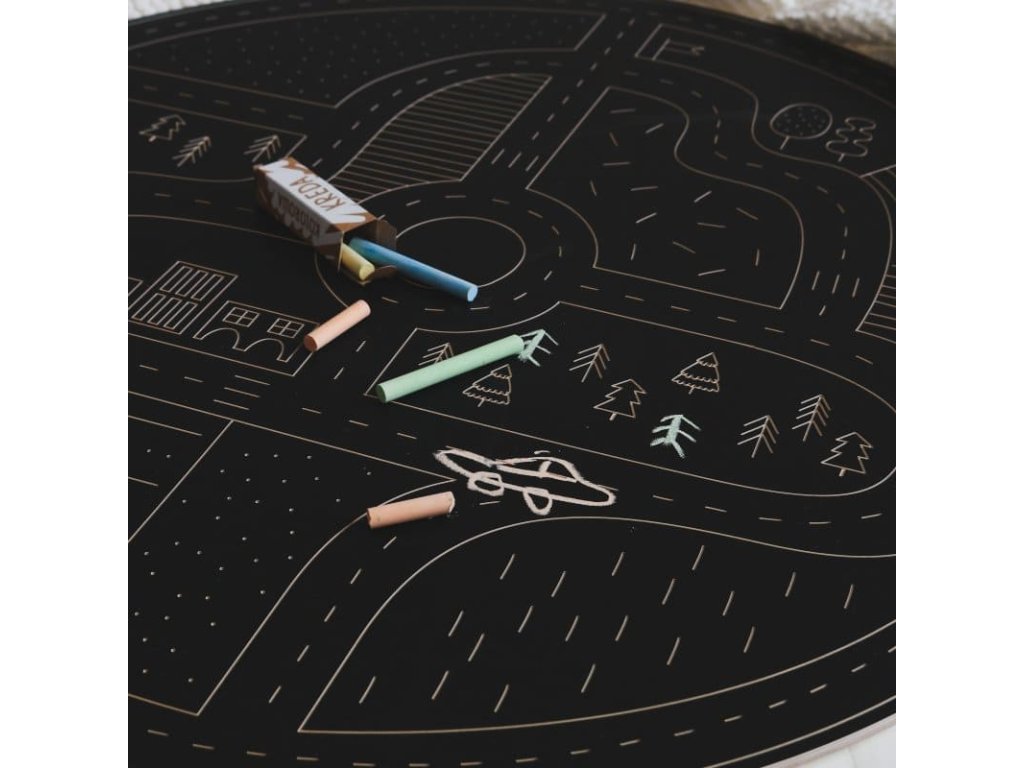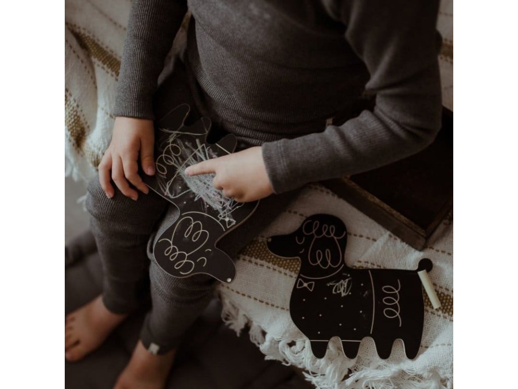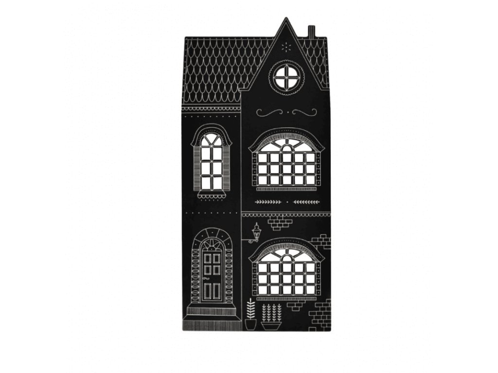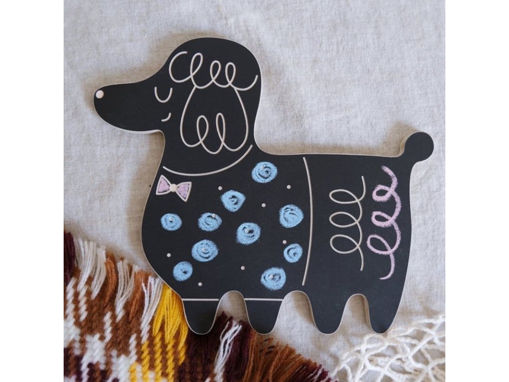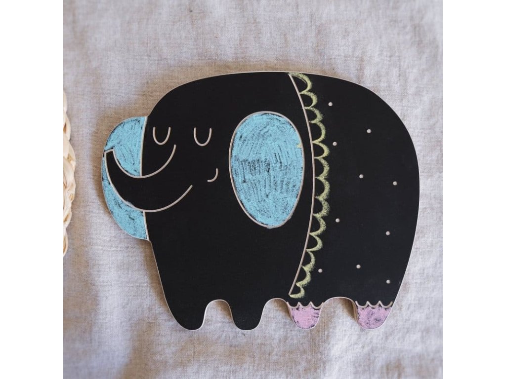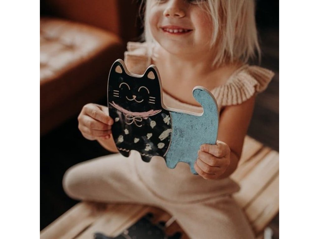Tabuľka má drevenú konštrukciu z brezovej preglejky, pričom jedna strana je upravená pre kreslenie kriedou, doplnená o gravírované detaily, ktoré zvyšujú zábavu aj hmatové vnímanie. Druhá strana je hladká, biela – ideálna na ďalšie kreatívne aktivity.