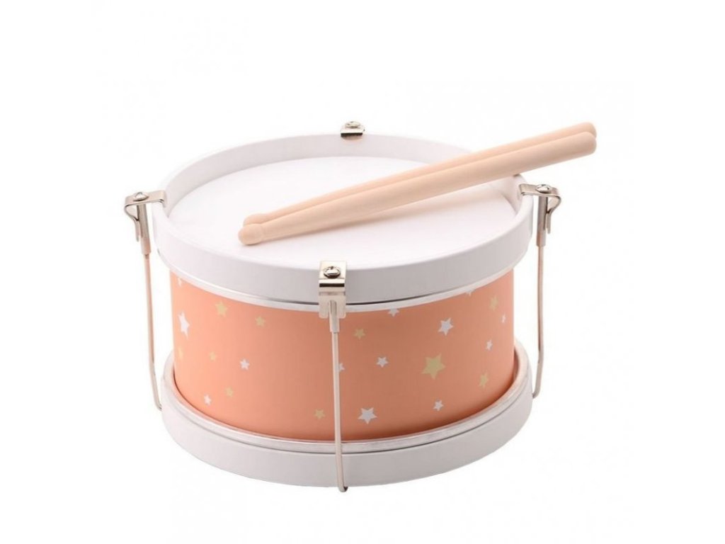 Ľahký a jednoducho uchopiteľný bubienok má nastaviteľný popruh, vďaka ktorému si ho dieťa môže zavesiť na krk alebo cez plece a pohodlne s ním chodiť po izbe. Jemné, pastelové farby s hviezdičkovým motívom robia z bubna aj krásny dekoratívny prvok do detskej izby.