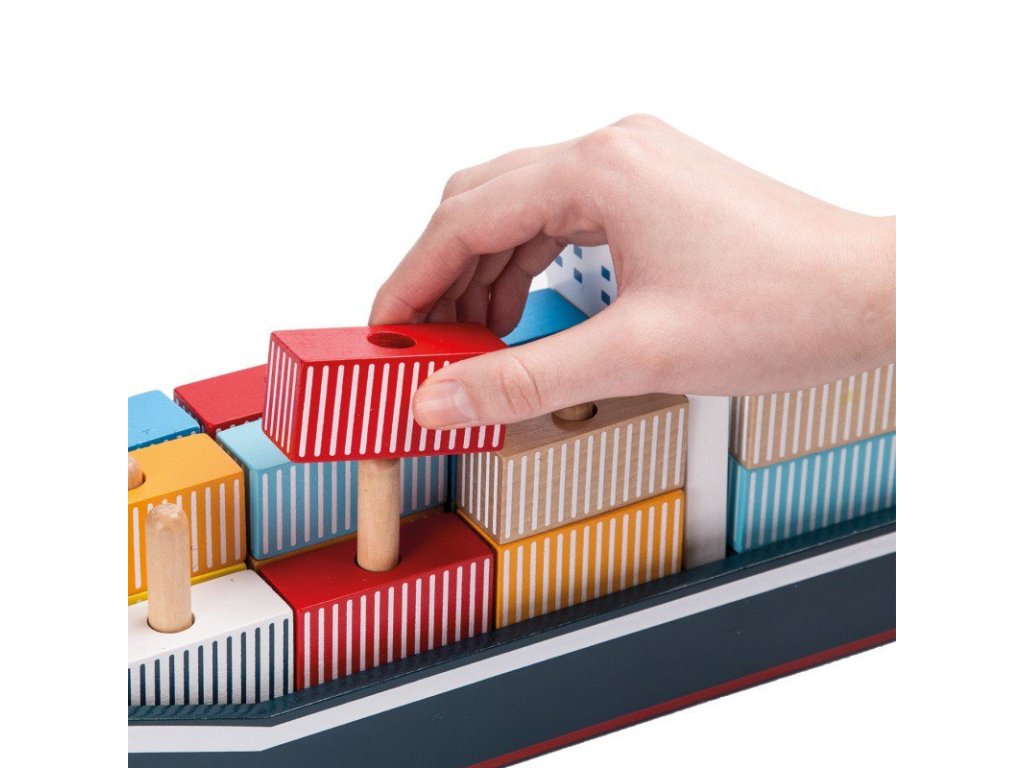 Vstúpte do sveta fantázie a stavania s touto krásnou drevenou kontajnerovou loďou! Hračka obsahuje až 34 dielov, ktoré umožňujú deťom nakladať, vykladať a prenášať náklad ako skutočný námorný kapitán.