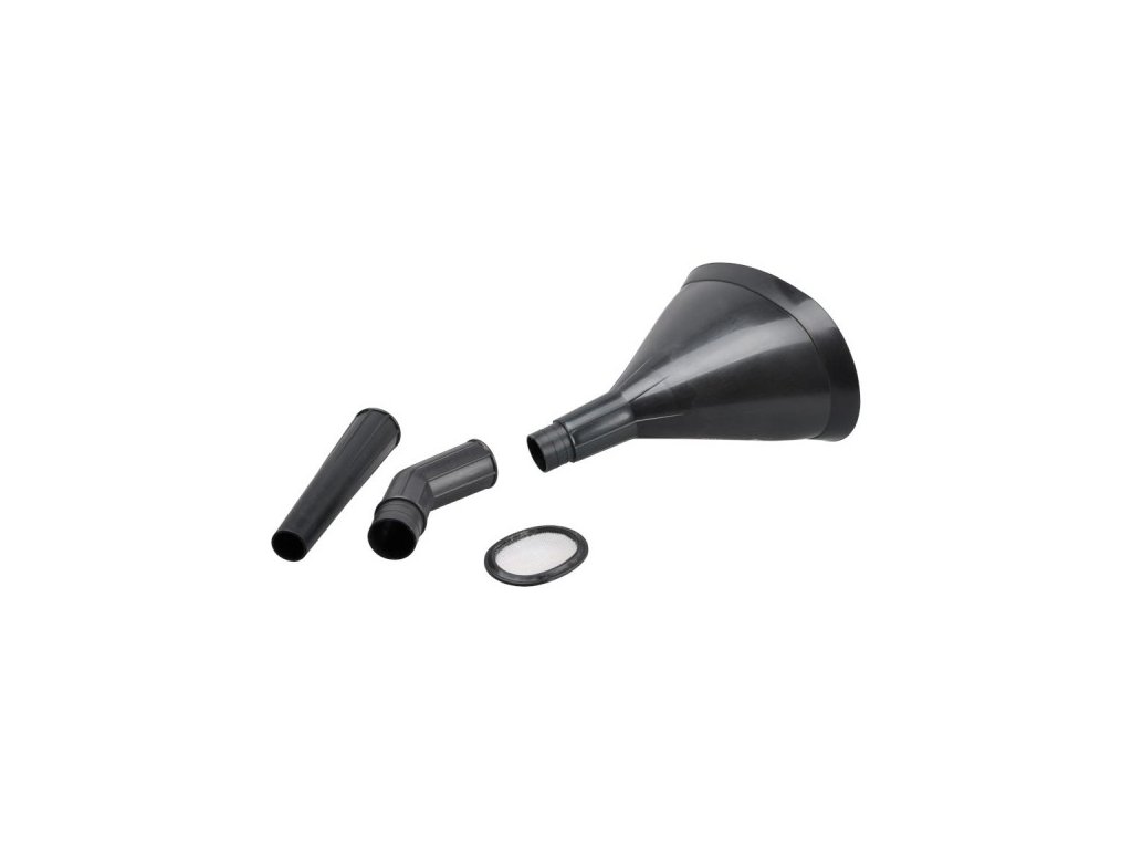 Lievik 3-dielny. Plastový lievik skladaný z troch častí, upraviteľný podľa potreby. Predovšetkým je vhodný pre nalievanie benzínu, oleja, vody a ďalších látok. V čiernom prevedení s nadstavcami.