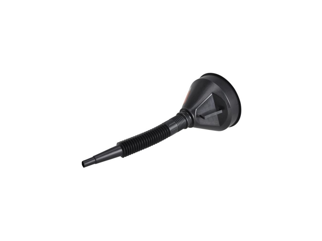 Lievik FLEXI. Plastový lievik so zabudovaným sitkom a ohybným lievikom. Predovšetkým je vhodný pre nalievanie benzínu, oleja, vody a ďalších látok.