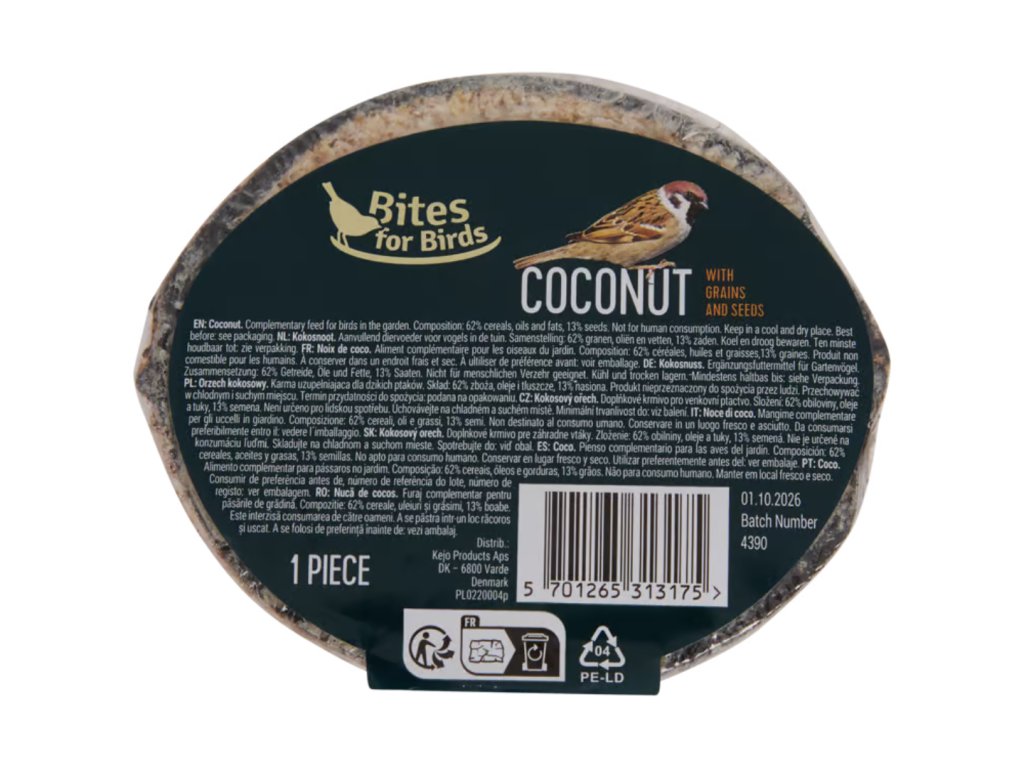 Doprajte vtákom vo svojej záhrade chutnú a výživnú potravu počas chladných mesiacov. Kokosový orech obsahuje zmes obilnín, semien, olejov, tukov a minerálov, ktorá podporí ich energiu a zdravie. Vďaka jednoduchému zaveseniu ho ľahko umiestnite na strom alebo krmítko. Ideálny spôsob, ako prilákať operencov a spríjemniť si zimné dni.
