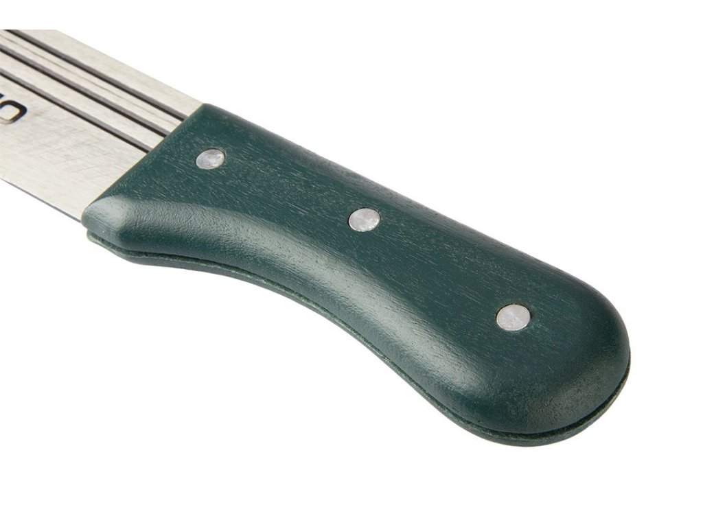 Rukoväť je vyrobená z tvrdého dreva a pripevnená kovovými nitmi, čo zaručuje pevné spojenie s čepeľou a dlhú životnosť nástroja. Vďaka ergonomickému tvaru dobre padne do ruky, čím zvyšuje komfort aj pri dlhšej práci.