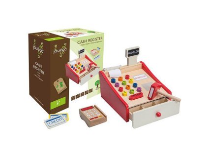 Drevená pokladňa so skenerom, kartou, čítačkou a priehradkou na peniaze. Rozmery 17,5 × 26,5 × 16,5 cm. Od 3 rokov.