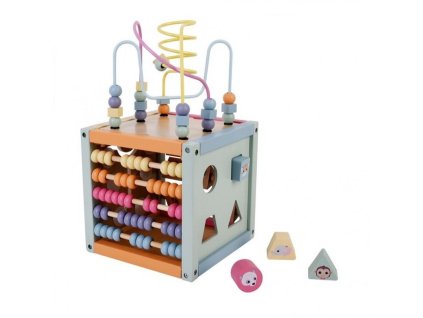 Multifunkčná drevená kocka s množstvom zábavných aktivít, ktorá rozvíja jemnú motoriku, koordináciu aj poznávanie farieb, tvarov a zvieratiek. Odnímateľný labyrint.