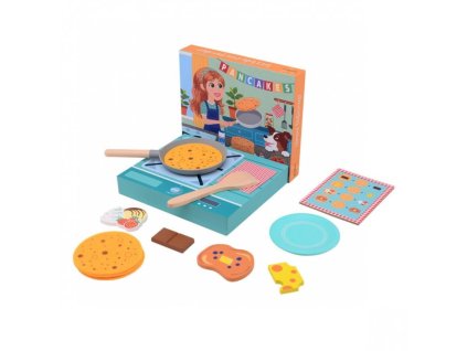 Drevený set s panvičkou, palacinkami a doplnkami pre deti od 3 rokov. Obsahuje 13 ks. Podporuje fantáziu a rozvoj motoriky.