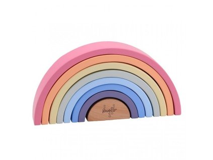 Drevená dúha z 8 dielov v jemných pastelových farbách. Pomáha rozvíjať motoriku, logiku a učenie farieb. Odporúčaná od 12 mesiacov.