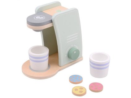 Drevený kávovar s hrnčekom, lyžičkou, 3 kapsulami kávy a 3 topingmi. Rozmer 10,5 × 16 × 17,5 cm. Od 36 mesiacov.