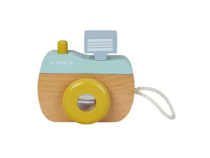 Drevený fotoaparát s otočnou šošovkou, kaleidoskopom a bavlneným pútkom. Rozmer 10 × 3,5 × 9 cm. FSC drevo. Od 24 mesiacov.